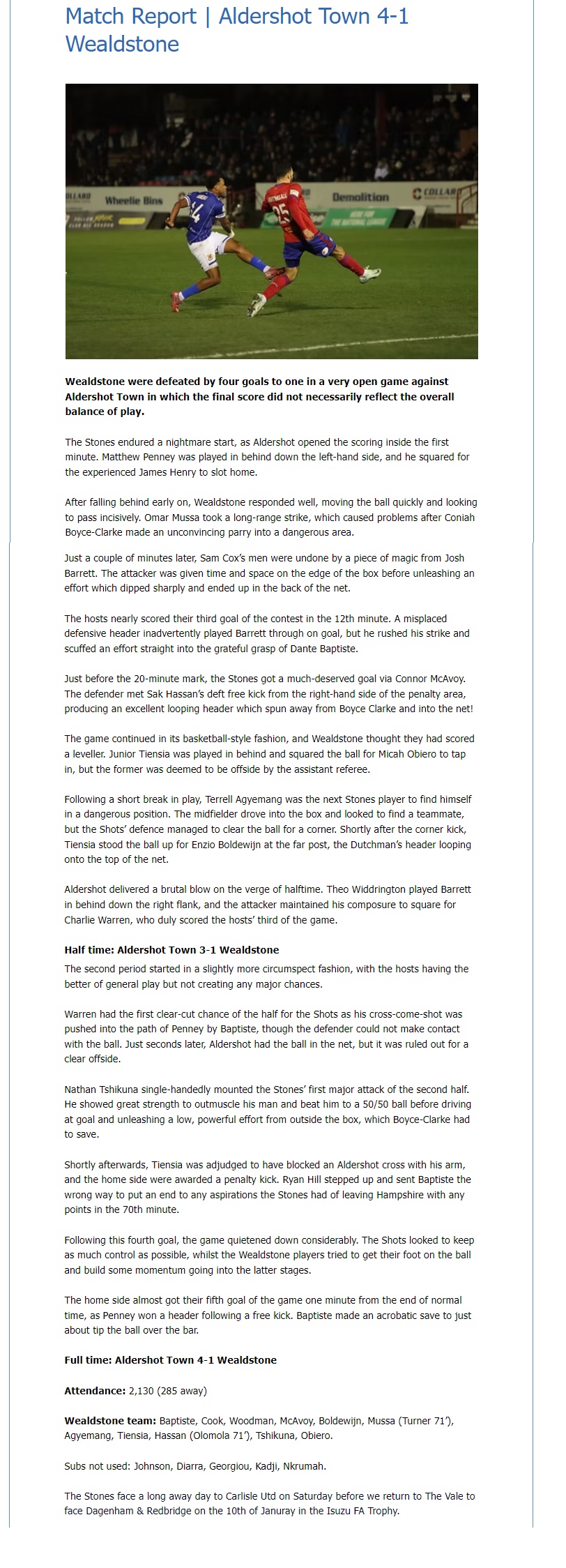 Wealdstone applied some late pressure on the Aldershot Town goal in the final 10 minutes of the game, but as The Shots saw out the threat, ultimately it was a performance which Shots will take plenty of positives from going into their first game of 2026 against Solihull Moors back at The EBB Stadium.