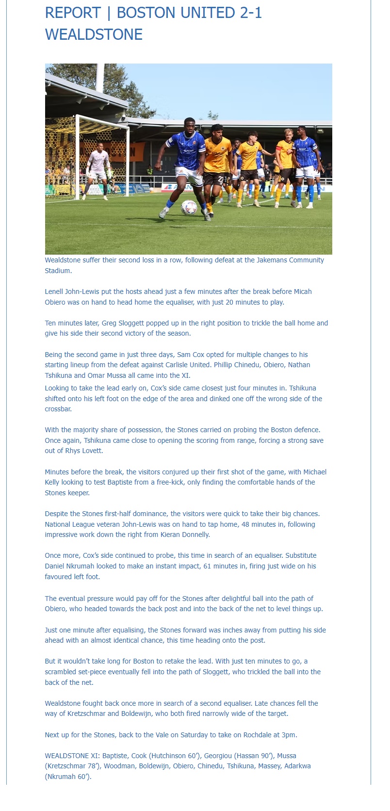 Wealdstone (3-1-4-2): Dante Baptiste; Jack Cook (Dom Hutchinson 61), Deon Woodman, Philip Chinedu; Alfie Massey; Enzio Boldewijn, Omar Mussa (Max Kretzschmar 78), Nathan Tshikuna, Anthony Georgiou (Sakariya Hassan 90); Sean Adarkwa (Daniel Nkrumah 61), Micah Obiero. Subs (not used): Dylan Kadji, Junior Tienisa, Lucas Covolan (gk).