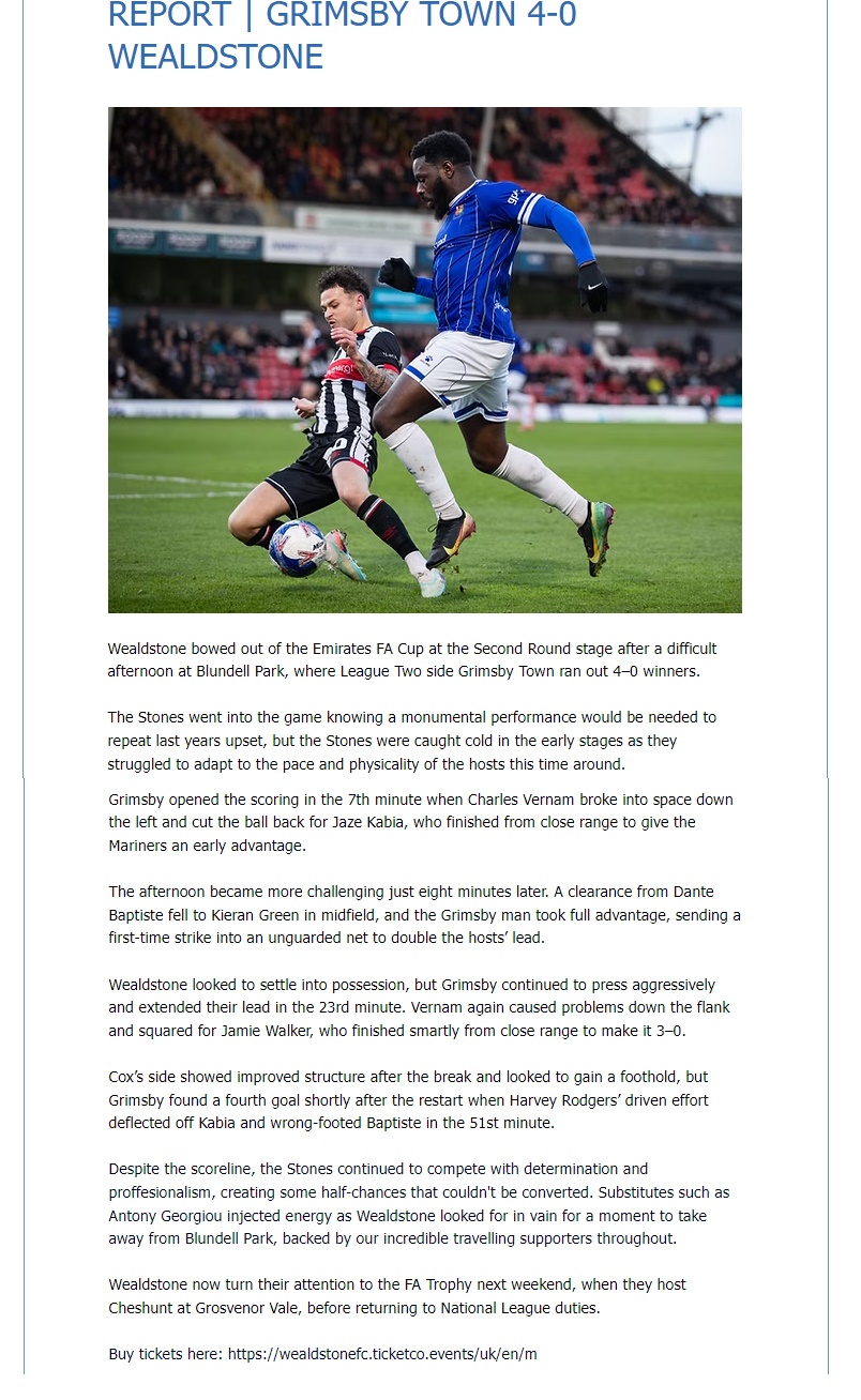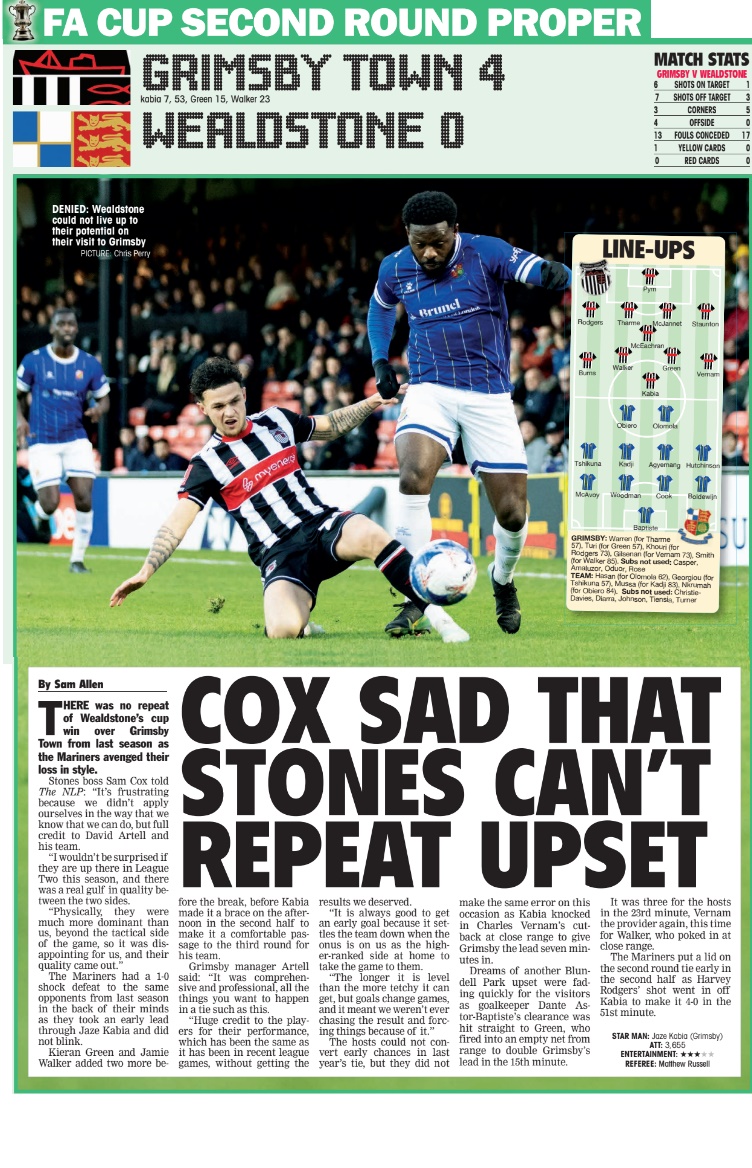 The Stones were also aiming to knock the Mariners out of the FA Cup for the second consecutive season after recording a 1-0 first-round victory at Blundell Park last year. Only Enzio Boldewijn and captain Jack Cook remained in their starting XI from that clash.