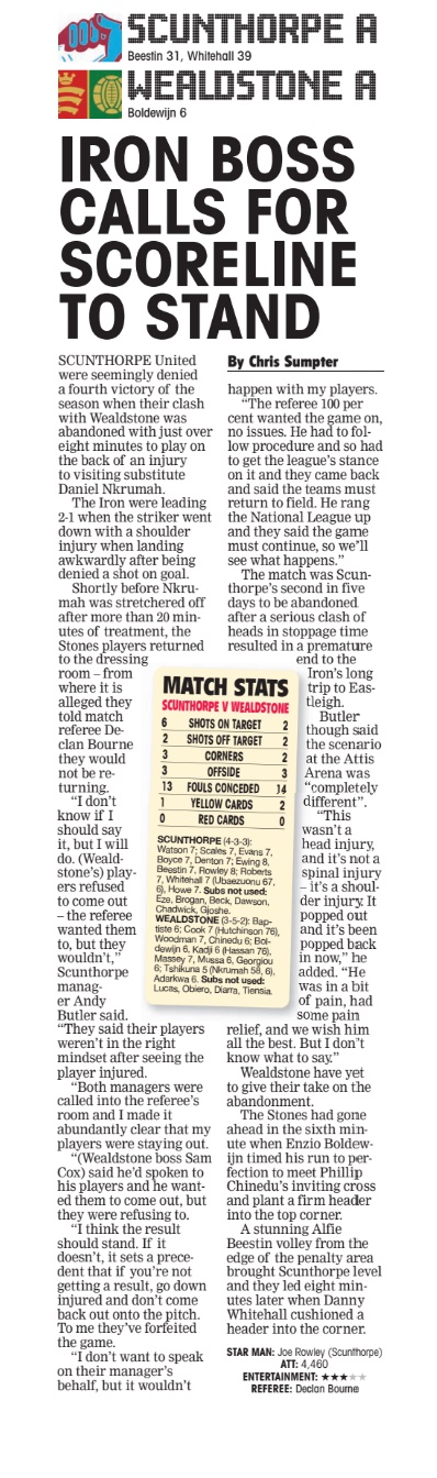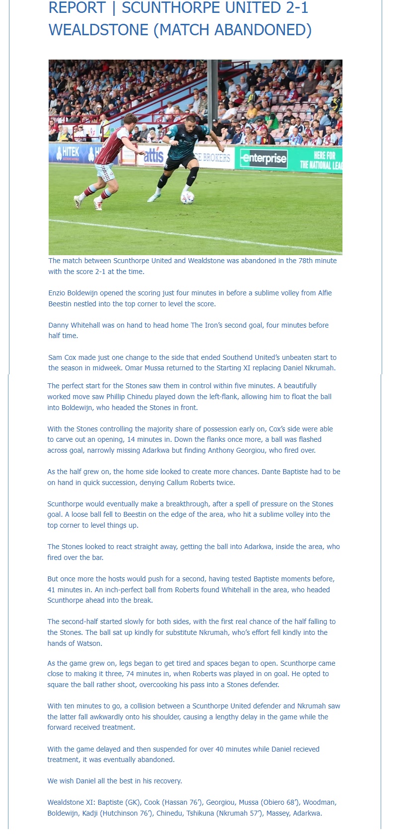 With just one major attack to report in the second half the game would come to a sour end in unbelievably a similar manner to the previous game with play being brought to an end via abandonment. After Wealdstone substitute Daniel Nkurmah was brought down inside the Scunthorpe penalty area, the forward would remain on the floor requiring medical assistance that took a substantial amount of time, resulting in the Iron’s second abandonment in a week.