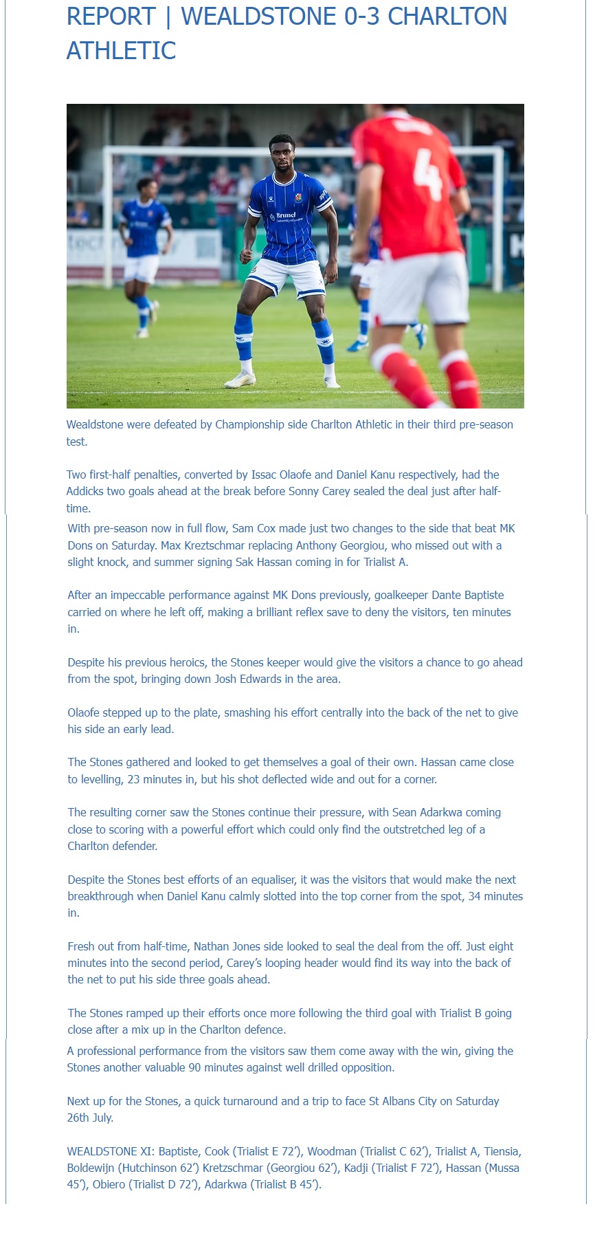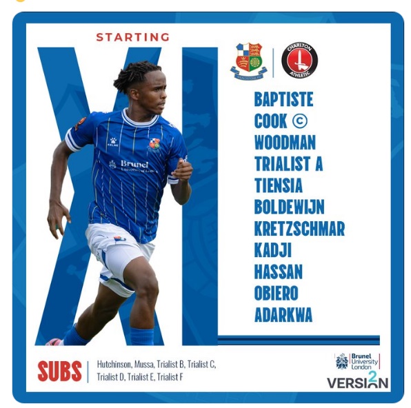 Wealdstone: Baptiste, Cook (Trialist D 71), Woodman (Trialist C 62), Trialist A, Tiensia, Boldewijn (Georgiou 62), Kretzchmar (Hutchinson 62), Kadji (Trialist E 71), Hassan (Trialist B 46), Obiero (Trialist F 71), Adarkwa (Mussa 46)