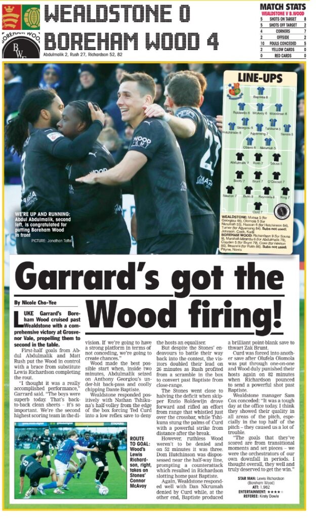 Two goals in each half were enough to give Boreham Wood an emphatic 4–0 win against Wealdstone in West London. The win was not only Wealdstone’s first home defeat since August, but it also propelled Luke Garrard’s men to the dizzy heights of second place in the Enterprise National League table.