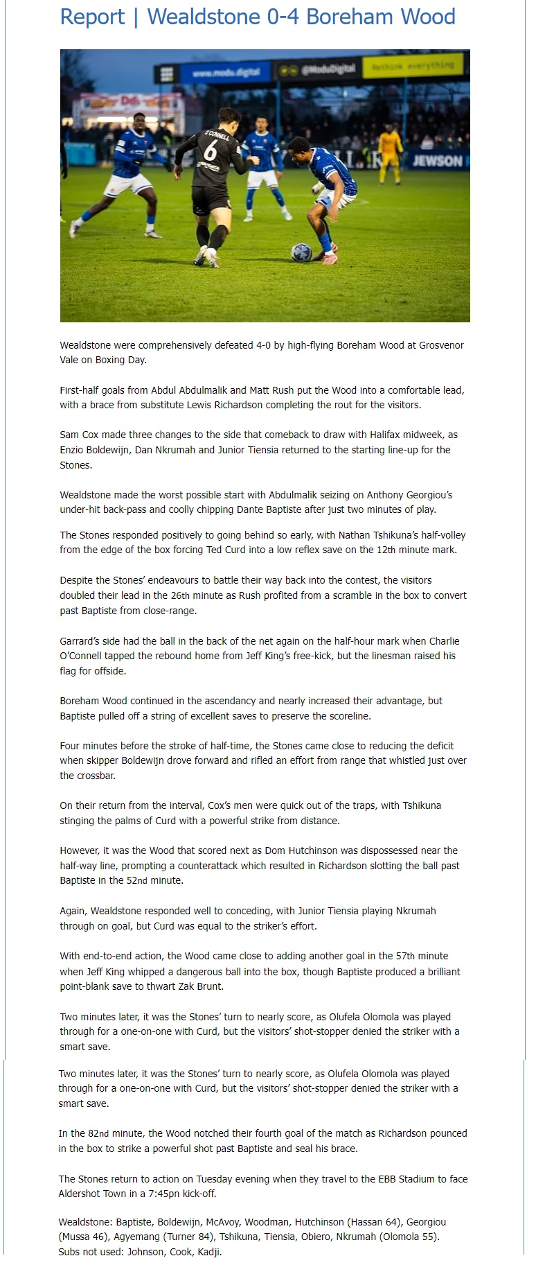 Boreham Wood have played better and lost this season, but were clinical against a normally well-organised Wealdstone team. Richardson was excellent and, if Sousa does have a period on the sidelines, who better to take his place? The score was slightly flattering for Boreham Wood, and Ted Curd had his best game for the club in goal, producing saves at crucial times. It was a fantastic turnout of 358 Boreham Wood fans, who played a role in helping the team secure the three points. With Solihull Moors to come to Meadow Park next Tuesday night, Wood will want to end a fantastic 2025 in fine style.