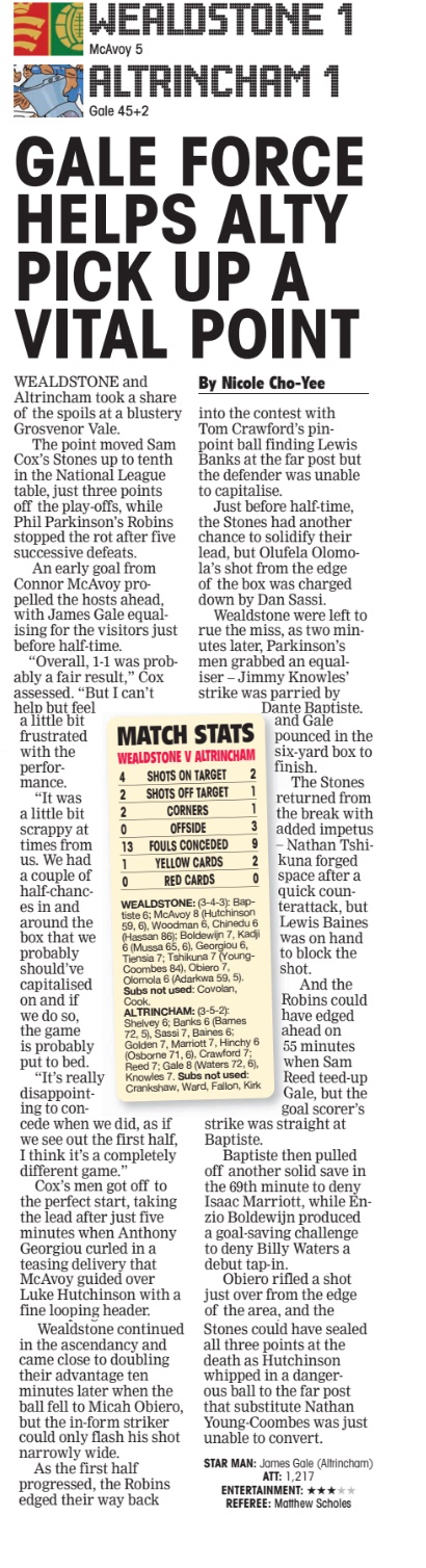 Alty were trailing to an early Wealdstone goal but refused to be blown off course as Gale finished off a move involving Tom Crawford and Jimmy Knowles to haul his side level in first half added time.