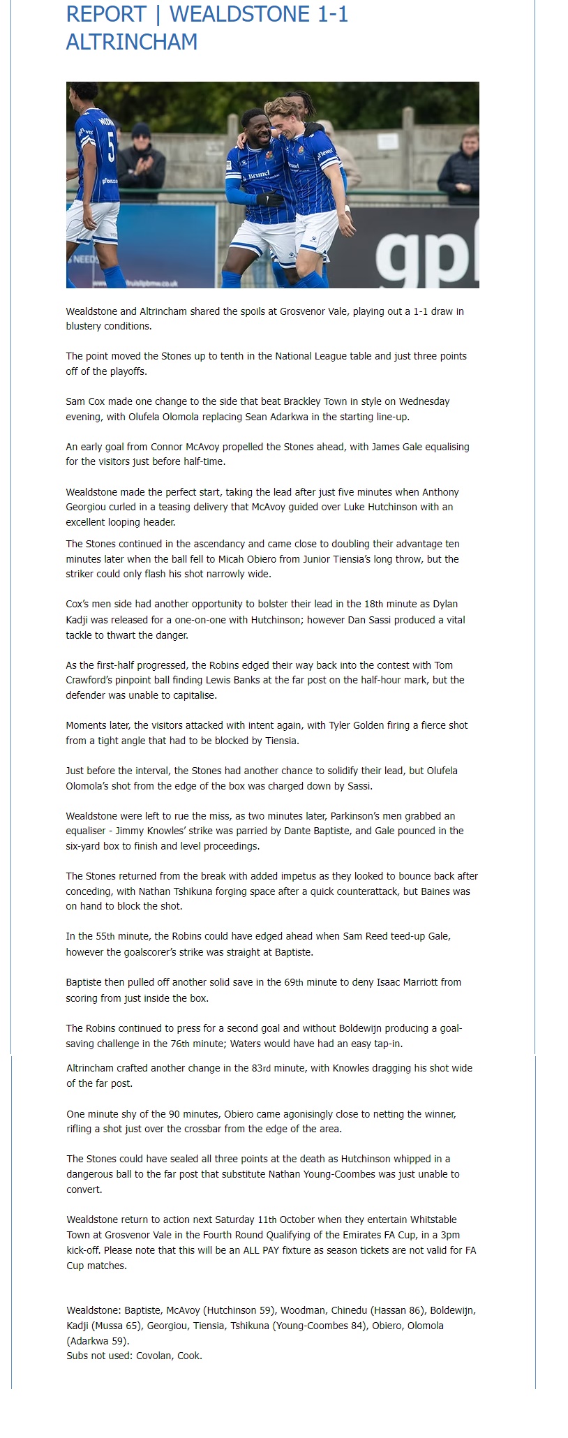 Altrincham Hutchinson; Banks (Barnes, 72′), Reed, Baines (c), Marriott, Gale (Waters, 72′), Knowles, Hinchy (Osborne, 72′), Crawford, Golden, Sassi. Subs not used: Crankshaw, Ward, Fallon, Kirk.