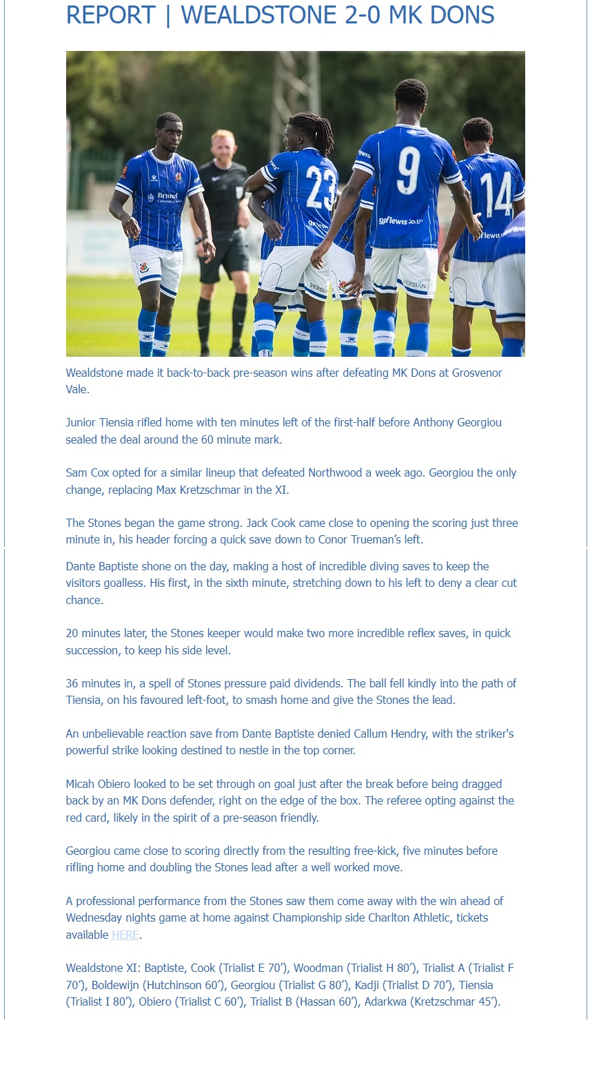 With ten minutes until half-time, Wealdstone took the lead. Junior Tiensia did well to strike the ball on the half-volley and fire home to give the Stones the advantage. 0-1