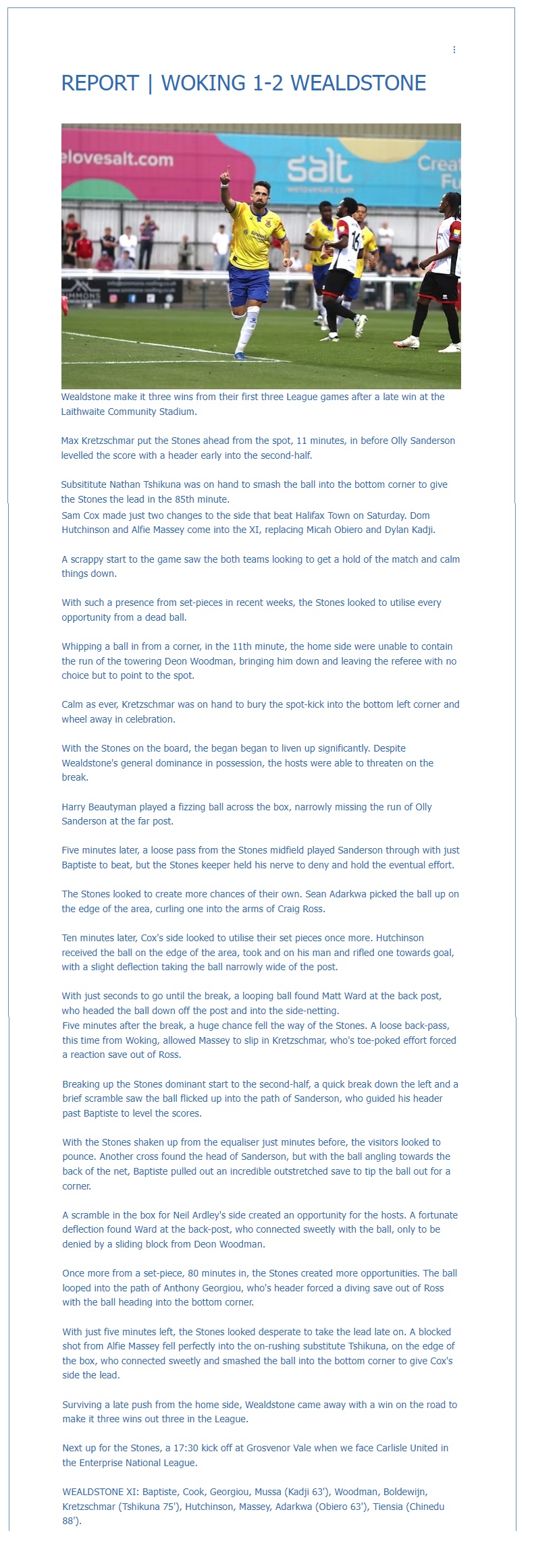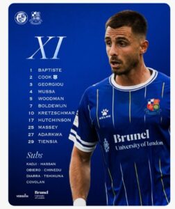 Wealdstone: Baptiste, Cook, Georgiou, Mussa (Kadji 62’), Woodman, Boldewijn, Kretzschmar (Tshikuna 84’), Hutchinson, Massey, Adarkwa (Obiero 62’), Tiensia Subs: Hassan, Chinedu, Diarra,, Covolan Goals: Kretzschmar 14’, Tshikuna 84’ Yellow Cards: Cook 21’, Massey 41’, Adarkwa 49’, Boldewijn 61’, Hutchinson 97