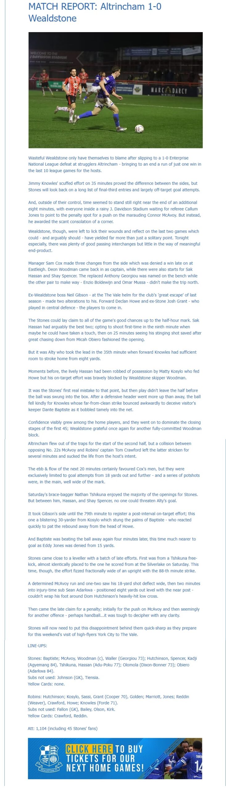 Altrincham Hutchinson; Grant (Cooper, 70′), Marriott, Howe, Knowles (Forde, 70′), Kosylo, Reddin (Weaver, 90’+3), Crawford (c), Golden, Jones, Sassi. Subs not used: Bailey, Fallon, Olson, Kirk.