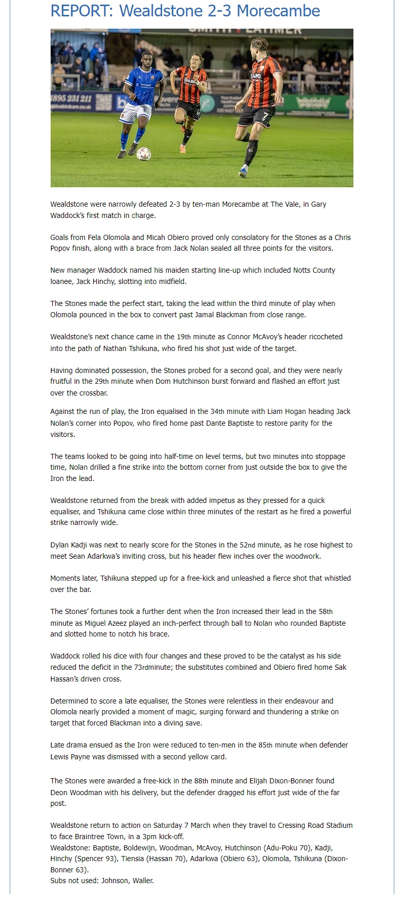 A brace from Jack Nolan and a goal from Chris Popov secured the three points on the road against Wealdstone.A fast start to proceedings for Wealdstone as Junior Tiensia drove down the left-hand side, he was brought down by Lewis Payne who was shown a yellow card. The following free kick was then put into the area, the first ball was initially cleared by Gwion Edwards, it was then put back into the box, and turned home by Oluefla Olamola to put the hosts ahead. The first real chance for the Shrimps came in the 14th minute when Mo Sangare drove through the middle of the park and struck from distance but it was well held by Dante Baptiste. Another free kick from Wealdstone, floated in by Nathan Tshikuna saw Deon Woodman rise highest to head on goal but Jamal Blackman was there to gather. A corner came the way of Morecambe, Jack Nolan stepped up to take, it found the head of Liam Hogan at the back post, his header was on target and was headed home by Chris Popov to make it 1-1. Jamal Blackman was there to keep the scores level when Olufela Olomola saw a clear sight of goal but the ‘keeper was there to make a fantastic save down to his left. On the stroke of half-time, Mo Sangare picked up the ball deep into the Stones’ half, found Jack Nolan and he made no mistake dancing round his man to slot home to give the Shrimps the lead. HT: Wealdstone 1 – 2 Morecambe The first chance of the half fell to the hosts through Nathan Tshikuna, he struck from 18 yards out and his effort was way wide of the mark. Another chance for Wealdstone minutes later after a tidy ball was floated into the box, only for Dylan Kadji to head over the crossbar. A quick counter attack for the Shrimps saw Miguel Azeez find Jack Nolan darting into the Wealdstone area, he kept his composure and rounded Dante Baptiste to make it 3-1. Wealdstone found themselves with a free kick deep into the Morecambe half, Elijah Dixon-Bonner stepped up and smashed it over the bar. Wealdstone found their second in the 72nd minute through Micah Obiero, a cross put into the box wasn’t dealt with and it was tapped home from close distance. Wealdstone had the chance to equalise in the 85th minute but a strong diving save from Jamal Blackman denied them. Following this, Lewis Payne was shown a second yellow and was sent off. Defending until the end, multiple blocks from the Shrimps defence saw them take all three points in the end.