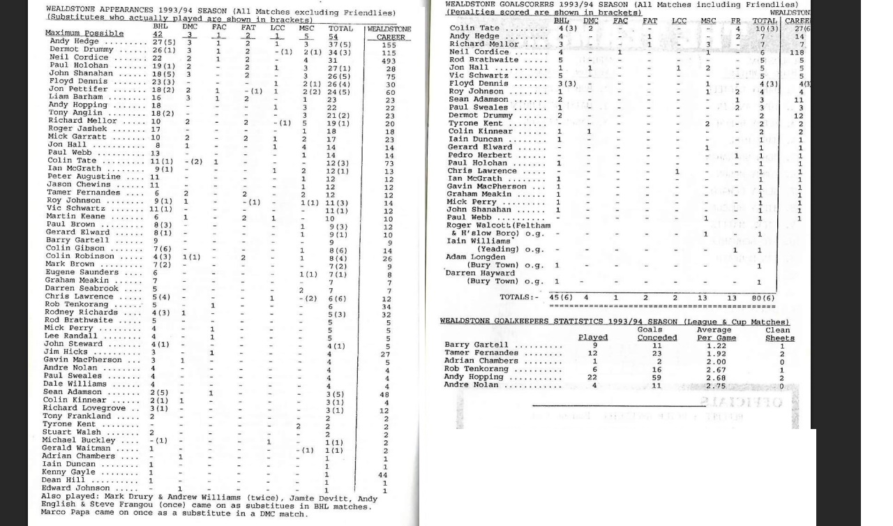 Appearance & Goalscorers info for the 1993-94 season HERE