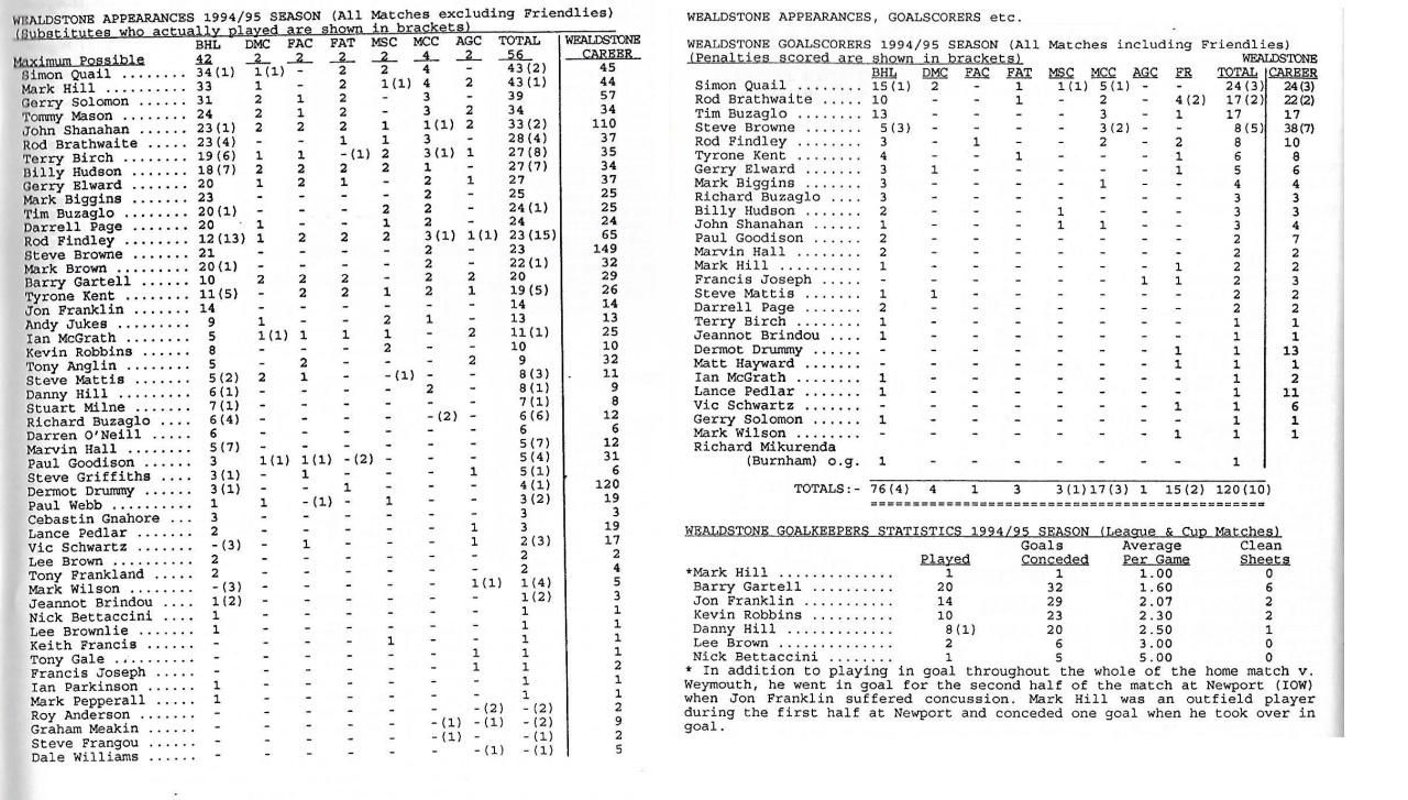 Appearance and Goalscorers info for the 1994-95 season HERE